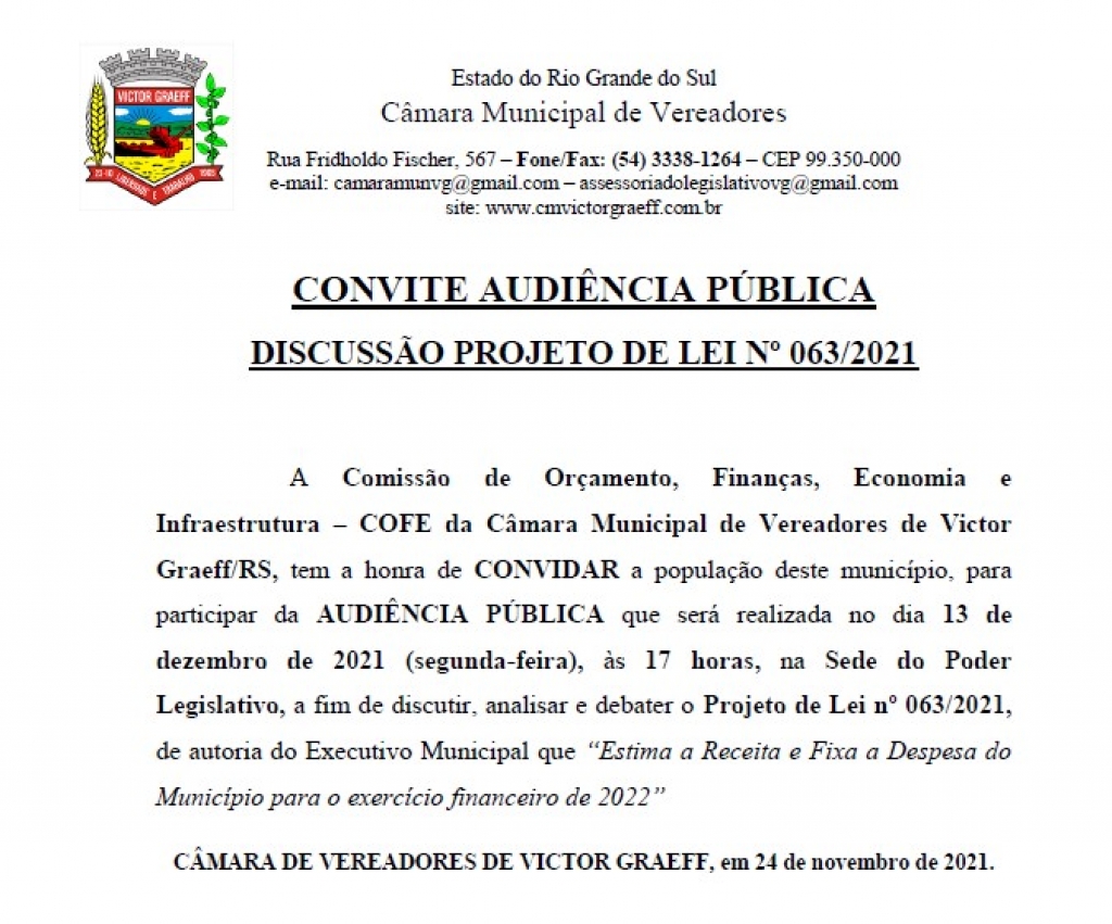 A Comissão de Orçamento, Finanças, Economia e Infraestrutura – COFE da Câmara Municipal de Vereadores de Victor Graeff/RS, tem a honra de CONVIDAR a população deste município, para participar da AUDIÊNCIA PÚBLICA que será realizada no dia 13 de dezembro de 2021 (segunda-feira), às 17 horas, na Sede do Poder Legislativo, a fim de discutir, analisar e debater o Projeto de Lei nº 063/2021, de autoria do Executivo Municipal que “Estima a Receita e Fixa a Despesa do Município para o exercício financeiro de 2022”